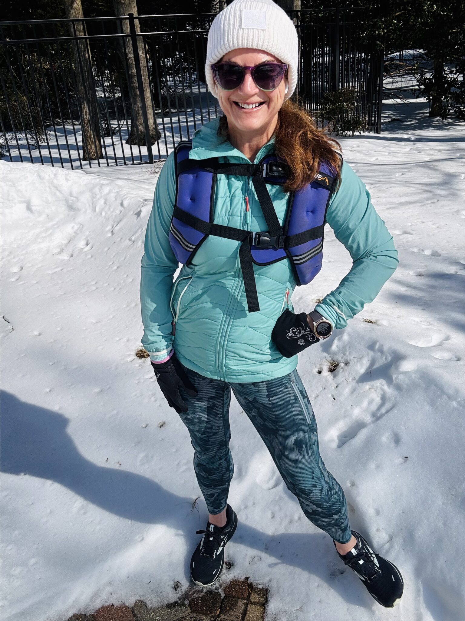Well, it was a balmy 31 degrees this morning and I had to get outside! The sidewalks and many of the streets are still icy. I was just so happy to get out with my weighted vest again. My Gortex Brooks Ghosts helped a lot!